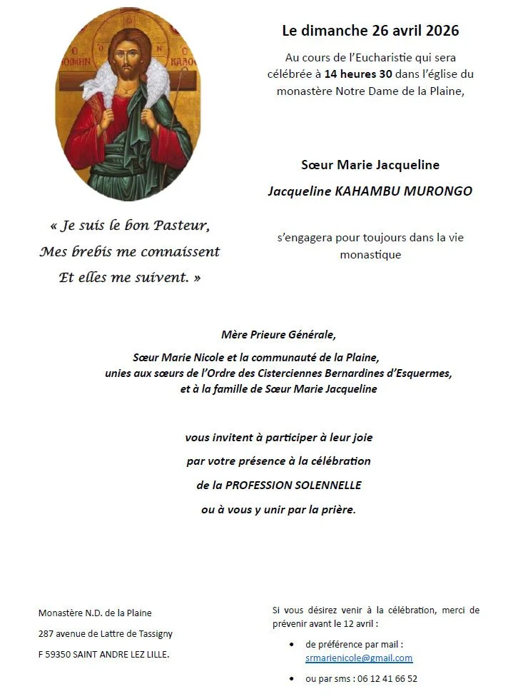 Mère Prieure Générale, Sœur Marie Nicole et la communauté de la Plaine, unies aux sœurs de l’Ordre des Cisterciennes Bernardines d’Esquermes, et à la famille de Sœur Marie Jacqueline